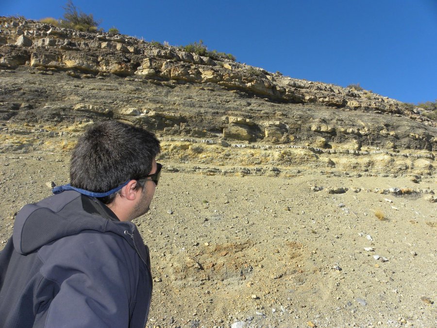 En la foto se puede apreciar al geólogo Andrés Molina, quien está observando la Formación Vaca Muerta. (de color oscuro) y por debajo la Formación Tordillo.