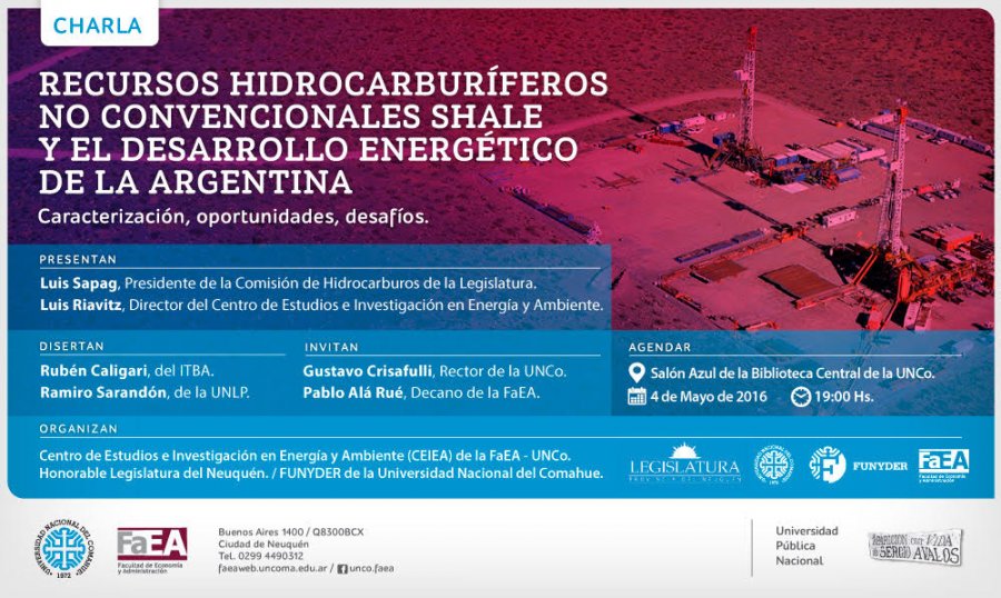 En la ocasión, se expondrá sobre "Condiciones para la explotación de recursos hidrocarburíferos no convencionales en Argentina", e "Impacto ambiental de la explotación de los recursos no convencionales", temáticas incluidas en el reciente libro "Recursos Hidrocarburíferos no Convencionales, Shale y el Desarrollo Energético de la Argentina; Caracterización, oportunidades, desafíos".