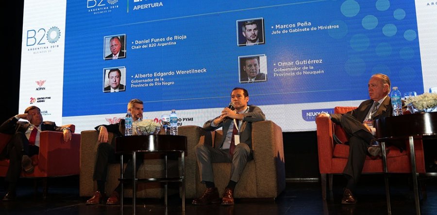 El gobernador Omar Gutiérrez y el jefe de Gabinete de la Nación, Marcos Peña, encabezaron el martes 14 de agosto por la tarde la apertura del Foro de Líderes Empresariales Región Comahue Business 20: la voz de la Comunidad de Negocios del G20, que se desarrolló en el Salón Rainbow del Hotel Casino Magic de la ciudad de Neuquén.