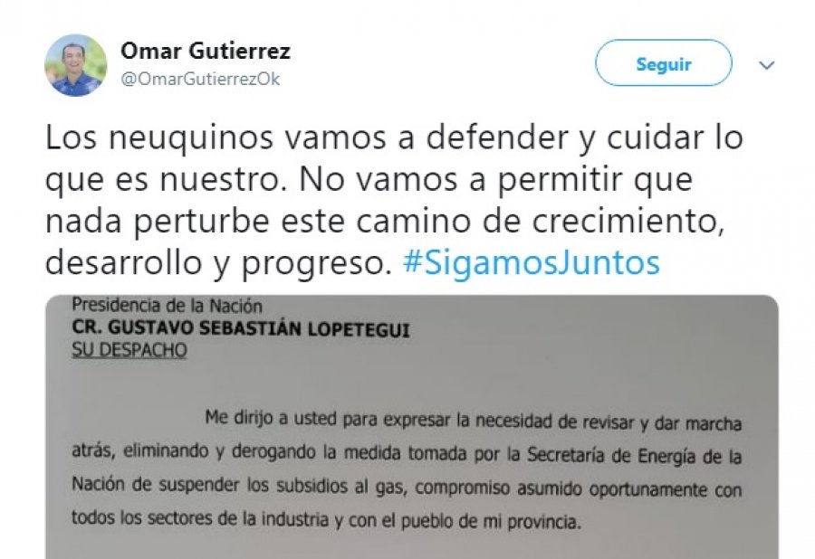 “Los neuquinos no vamos a permitir que nada perturbe este camino de crecimiento, desarrollo y prosperidad. Vamos a defender y cuidar lo nuestro, lo que con tanto esfuerzo hemos logrado. Es mi deber advertirlo que no respetar los compromisos asumidos no está a la altura de lo que Vaca Muerta y Neuquén significan como ejemplo en el desarrollo de la Argentina”, cierra el último párrafo de la carta firmada por Gutiérrez.