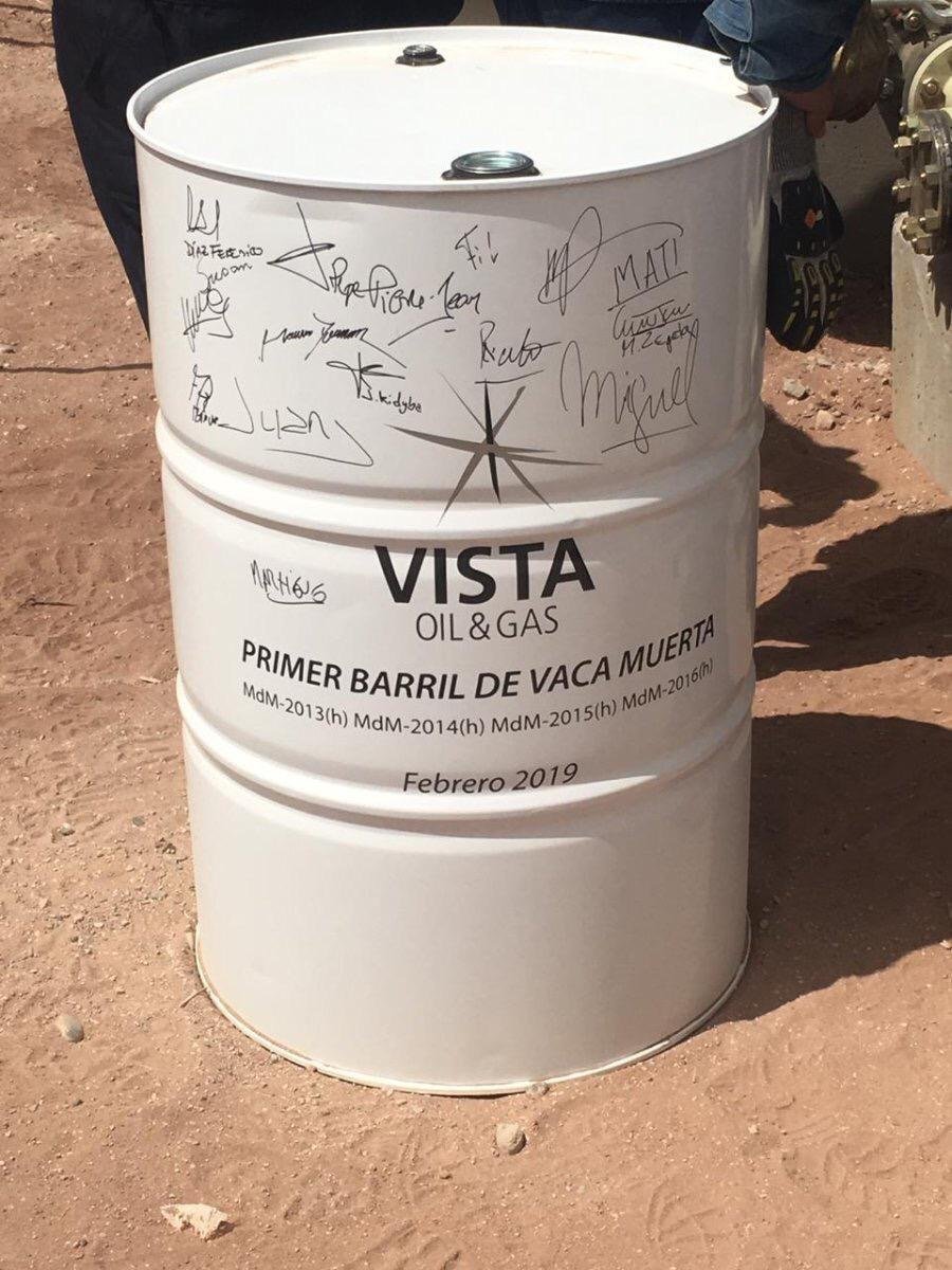 Apenas habían transcurrido unos pocos días de las perforaciones en el área de Bajada del Palo, y la empresa Vista Gas & Oil presentó el primer barril de petróleo extraído de Vaca Muerta.