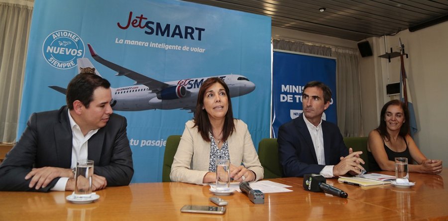 La ministra de Turismo, Marisa Focarazzo; el gerente general de JetSMART Airlines en Argentina, Gonzalo Pérez Corral y el director comercial de la compañía para América Latina, Víctor Mejía dieron a conocer el 27 de febrero las nuevas rutas aéreas que van desde Neuquén hacia Buenos Aires (El Palomar), Córdoba, Mendoza y Salta.
