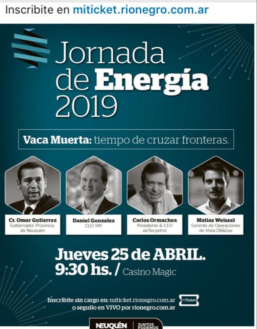 Para esta edición -la sexta, se contará- con la presencia del CEO de YPF, Daniel González; el presidente y CEO de Tecpetrol, Carlos Ormachea; el vicepresidente de Pan American Energy (PAE), Juan Martín Bulgheroni; el gerente de operaciones de la Cuenca Neuquina de Vista Oil&Gas, Matías Weissel; y el gobernador de Neuquén, Omar Gutiérrez.