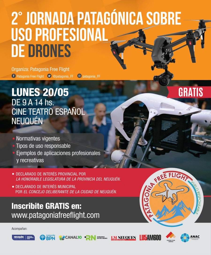 La agrupación patagónica de operadores de drones, “Patagonia Free Flight” en conjunto con la Fundación del Banco de la provincia del Neuquén y el Centro Pyme Adeneu, invitan a participar de la 2da jornada sobre el uso responsable de los VANT, mas conocidos como drones, con entrada libre y gratuita.