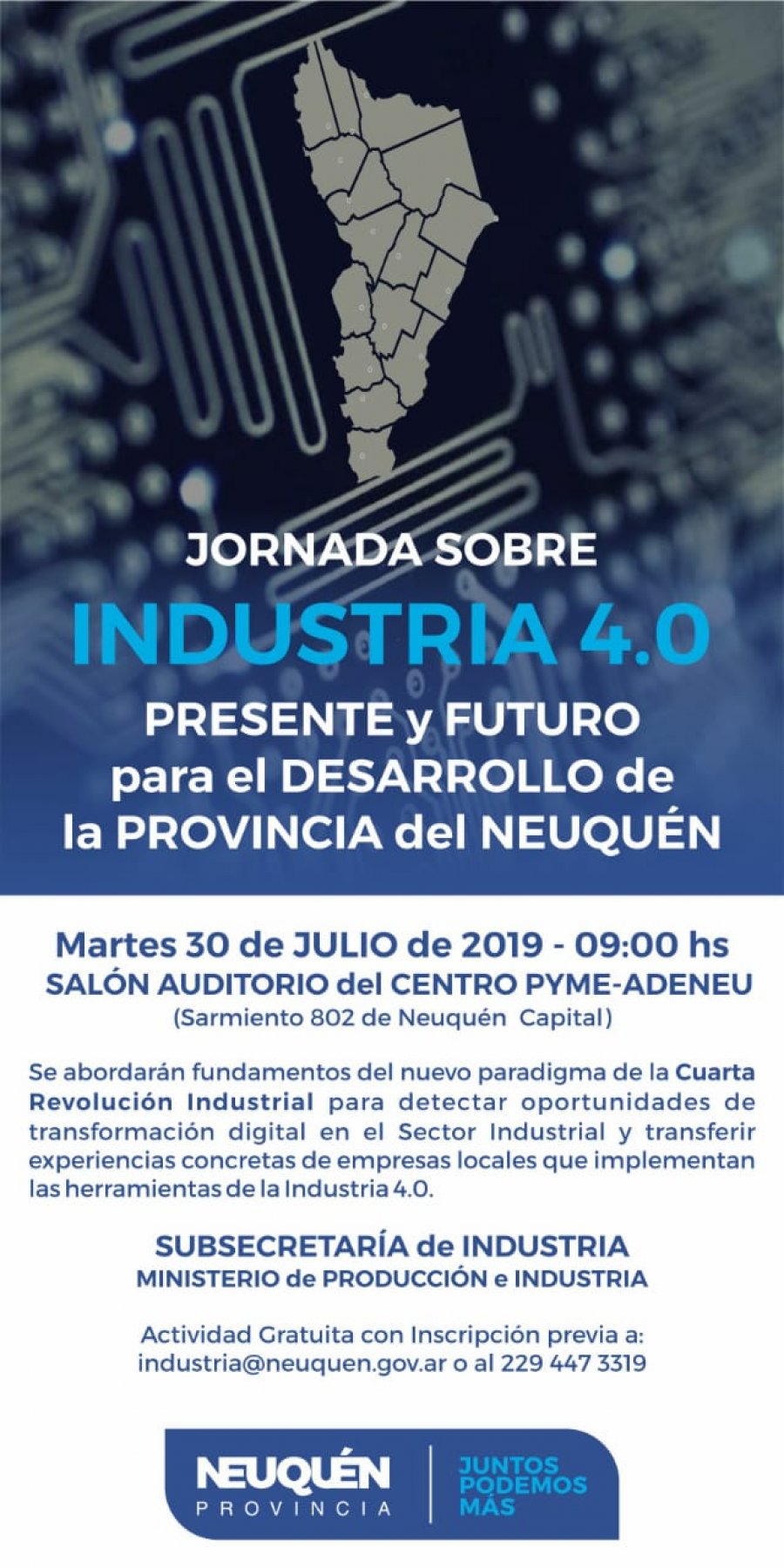 La subsecretaría de Industria de la provincia de Neuquén, invitó a los interesados a participar de la Jornada sobre Industria 4.0 que se desarrollará el día 30 de julio a las 9 horas en el Auditorio de Centro Pyme Adeneu (Sarmiento 802 de Neuquén capital).