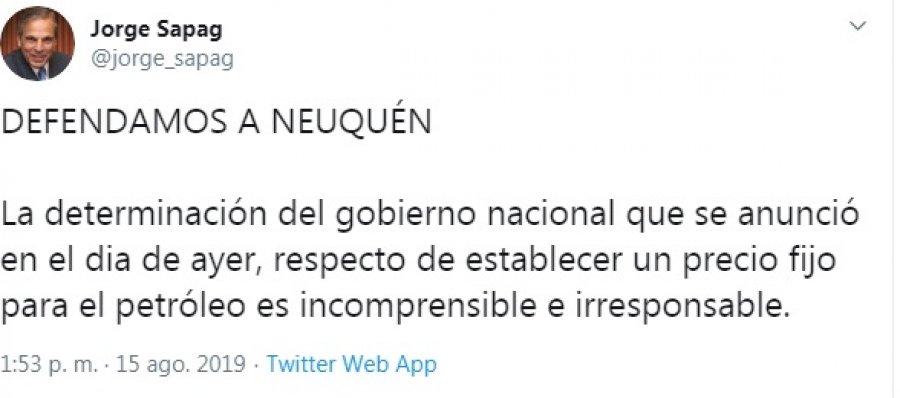 Desde la red social Twitter, el ex funcionario pidió “defender a Neuquén” y sostuvo que “la determinación del gobierno nacional que se anunció en el dia de ayer, respecto de establecer un precio fijo para el petróleo es incomprensible e irresponsable”.