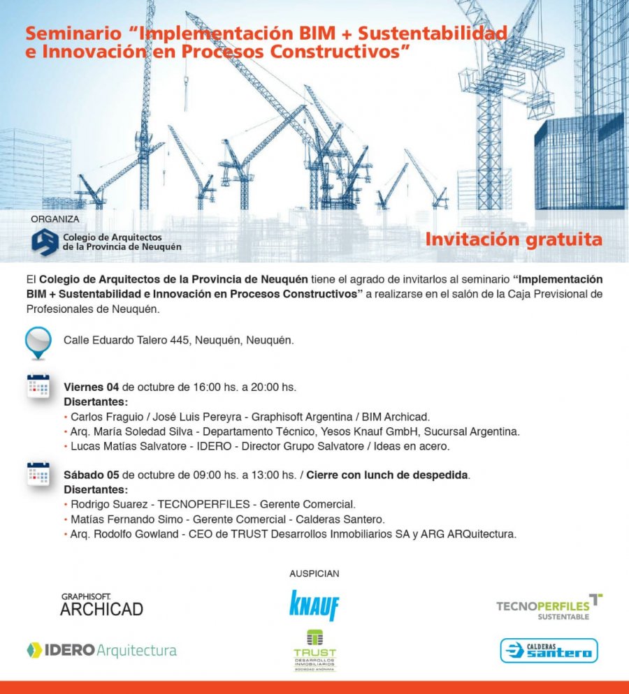 El Colegio de Arquitectos de la provincia de Neuquén invita a los interesados a participar del Seminario “Implementación BIM + Sustentabilidad e Innovación en Procesos Constructivos”, que se llevará a cabo entre el viernes 4 y sábado 5 de octubre en el Salón de la caja Previsional de Profesionales de Neuquén, Calle Eduardo Talero 445 Neuquén.
