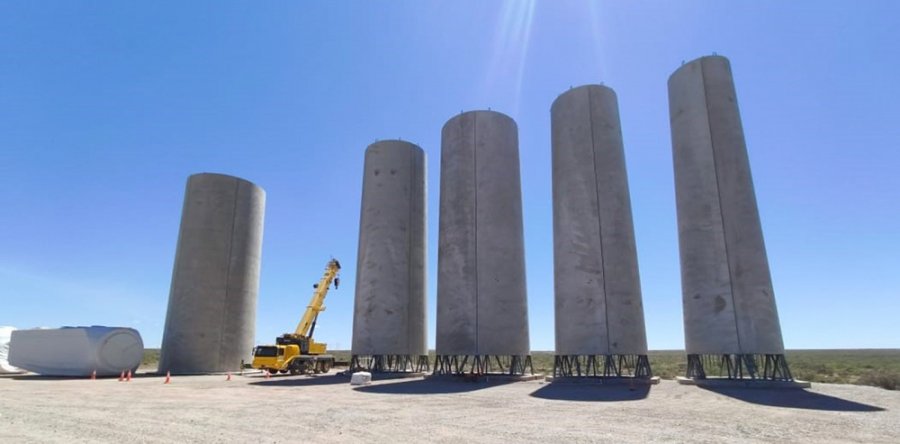 Las aspas de 50 a 70 metros de longitud que están siendo trasladas por estos días se suman a las torres de cemento que se producen en la localidad rionegrina de Allen y que desde hace más de un mes están siendo llevadas hasta Bajada Colorada.