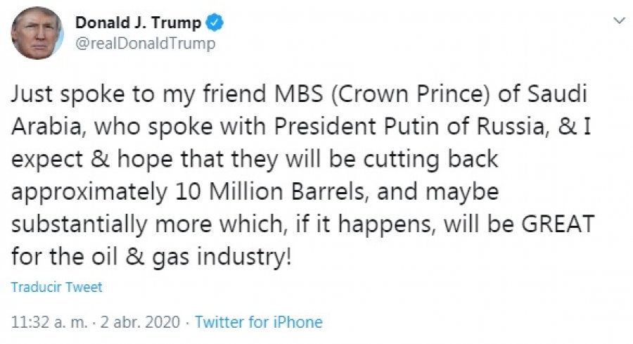 El mandatario norteamericano escribió en Twitter que acaba de hablar con su “amigo MBS (Mohammed Bin Salman) el príncipe heredero de Arabia Saudita, quien habló con el presidente (Vladimir) Putin de Rusia, y espero que reduzcan aproximadamente 10 millones de barriles, y tal vez sustancialmente más, lo que si sucede será excelente para la industria del petróleo y el gas”, señala Victoria Terzaghi en el diario “Río Negro”.