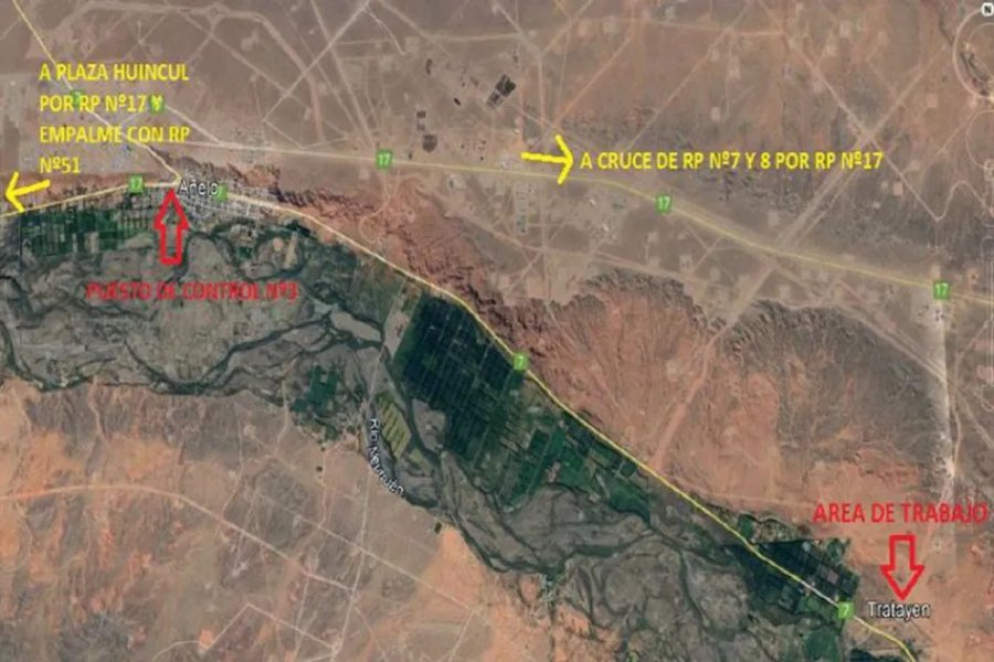 Por último, el puesto de control Nº3 estará en la zona urbana de Añelo, en el empalme de las rutas provinciales 7 y 17. Contribuirá a desviar los vehículos que se dirigen hacia Tratayen, San Patricio del Chañar, Neuquén y Centenario por ruta provincial 17 y luego, por ruta provincial 8 o, en su defecto, seguir por la 17 hacia Plaza Huincul y tomar luego la 51.