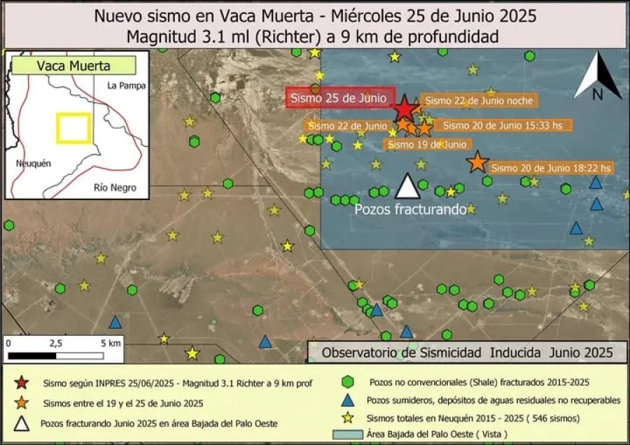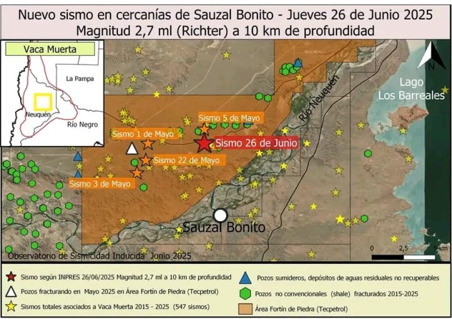 “Esos pozos están muy cercanos al epicentro del sismo (y de los 4 sismos ocurridos los días 1, 3, 5 y 22 de mayo), demostrando una vez más que los temblores en Vaca Muerta están asociados a la extracción de hidrocarburos no convencionales”, resaltaron desde el Observatorio y agregaron que ya son 36 los sismos que estarían asociados a la fractura hidráulica.