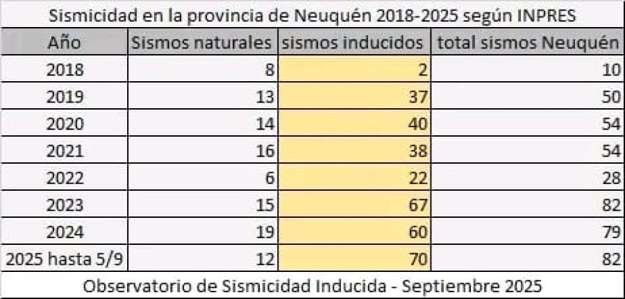 El Observatorio de Sismicidad Inducida informó que la provincia de Neuquén alcanzó un récord histórico de sismos vinculados a la industria hidrocarburífera en lo que va del año 2025. Según datos registrados por el INPRES, ya se contabilizan 82 eventos sísmicos, de los cuales 70 están asociados al fracking y solo 12 responden a mecanismos naturales. De esta forma, se supera la marca de 67, del año 2023, que hasta ahora había registrado la mayor cantidad de sismos inducidos.