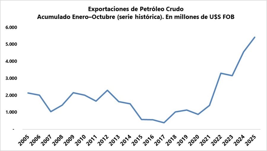 Particularmente, el petróleo crudo volvió a desempeñar un papel central en el dinamismo exportador. Entre enero y octubre de 2025, las ventas externas de crudo sumaron U$S 5.416 millones FOB, configurando el valor más alto de los últimos veinte años para este tramo del año. Este desempeño se vio acompañado también por el volumen exportado que llego al máximo de toda la serie histórica, lo que confirma un crecimiento simultáneo tanto en los valores como en las cantidades enviadas al exterior.