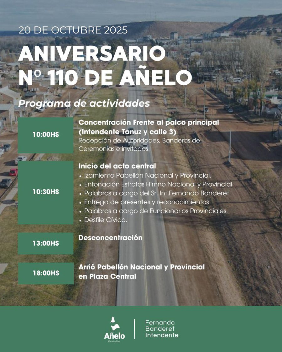El lunes 20 de octubre, Añelo, localidad cabecera de la explotación no convencional de hidrocarburos en Argentina, conmemorará su 110° Aniversario.