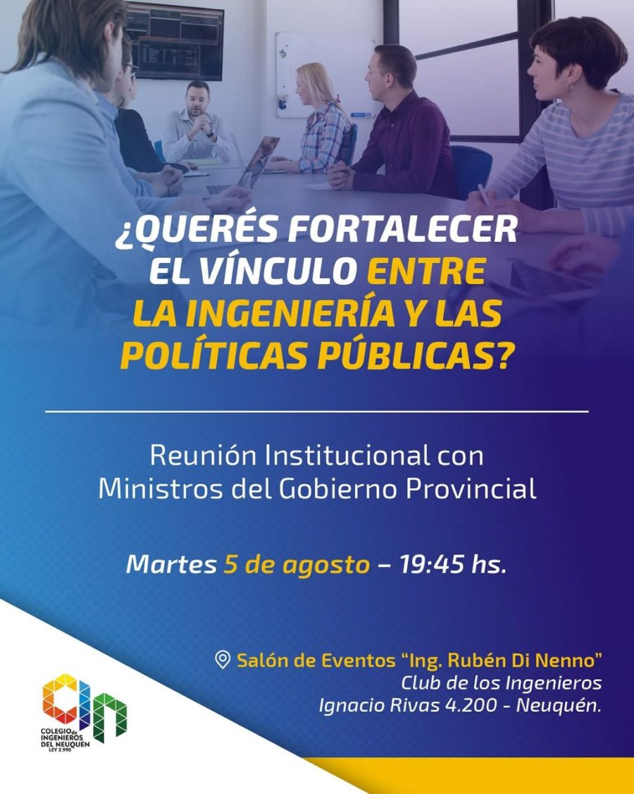 El próximo 5 de agosto, a las 19.45 horas, el Colegio de Ingenieros del Neuquén será sede de un encuentro institucional estratégico con ministros del Gobierno Provincial. La actividad tendrá lugar en el Salón de Eventos “Ing. Rubén Di Nenno”, ubicado en el Club de los Ingenieros (Ignacio Rivas 4200, Neuquén).