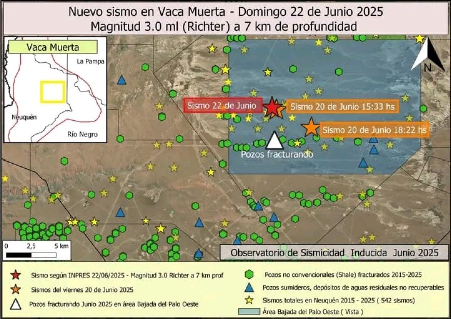 El Observatorio de Sismicidad Inducida informó que el domingo 22 de junio ocurrió un nuevo sismom, calculado y registrado por el INPRES (Instituto Nacional de Prevención Sísmica).