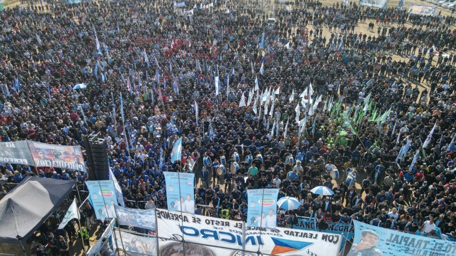 El secretario general del Sindicato de Petroleros Privados, Marcelo Rucci, encabezó el martes 5 de noviembre una multitudinaria Asamblea General en Añelo para explicar los alcances del último acuerdo paritario. “Estar acá arriba es un espectáculo increíble; es un honor saber que ustedes han confiado en nosotros para llevar adelante una negociación tan difícil y compleja”, expresó.
