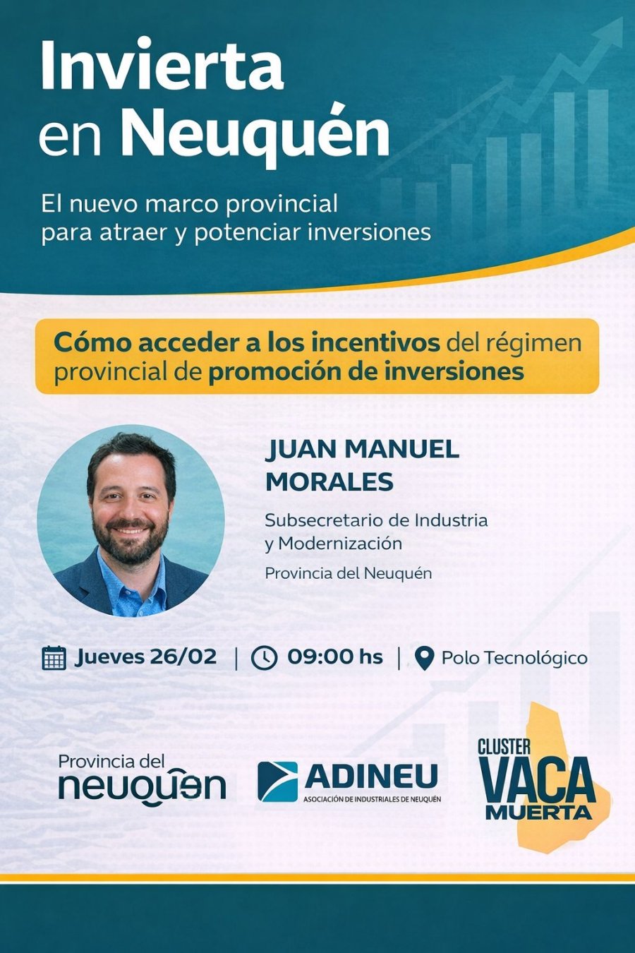 Durante el encuentro se abordarán los principales lineamientos del programa “Invierta en Neuquén”, con especial foco en cómo acceder a los incentivos previstos dentro del régimen provincial. La iniciativa busca generar condiciones favorables para la radicación y ampliación de proyectos productivos en el territorio neuquino.