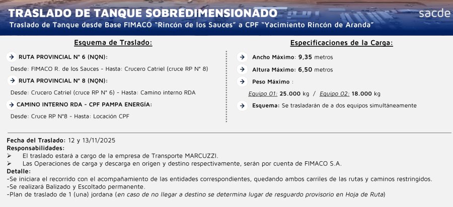 Las firmas SACDE y Pampa Energía informaron a la comunidad que entre el miércoles 12 y el jueves 13 de noviembre, se realizará el traslado de dos tanques de grandes dimensiones desde la Base FIMACO, de Rincón de los Sauces hasta el yacimiento Rincón de Aranda.