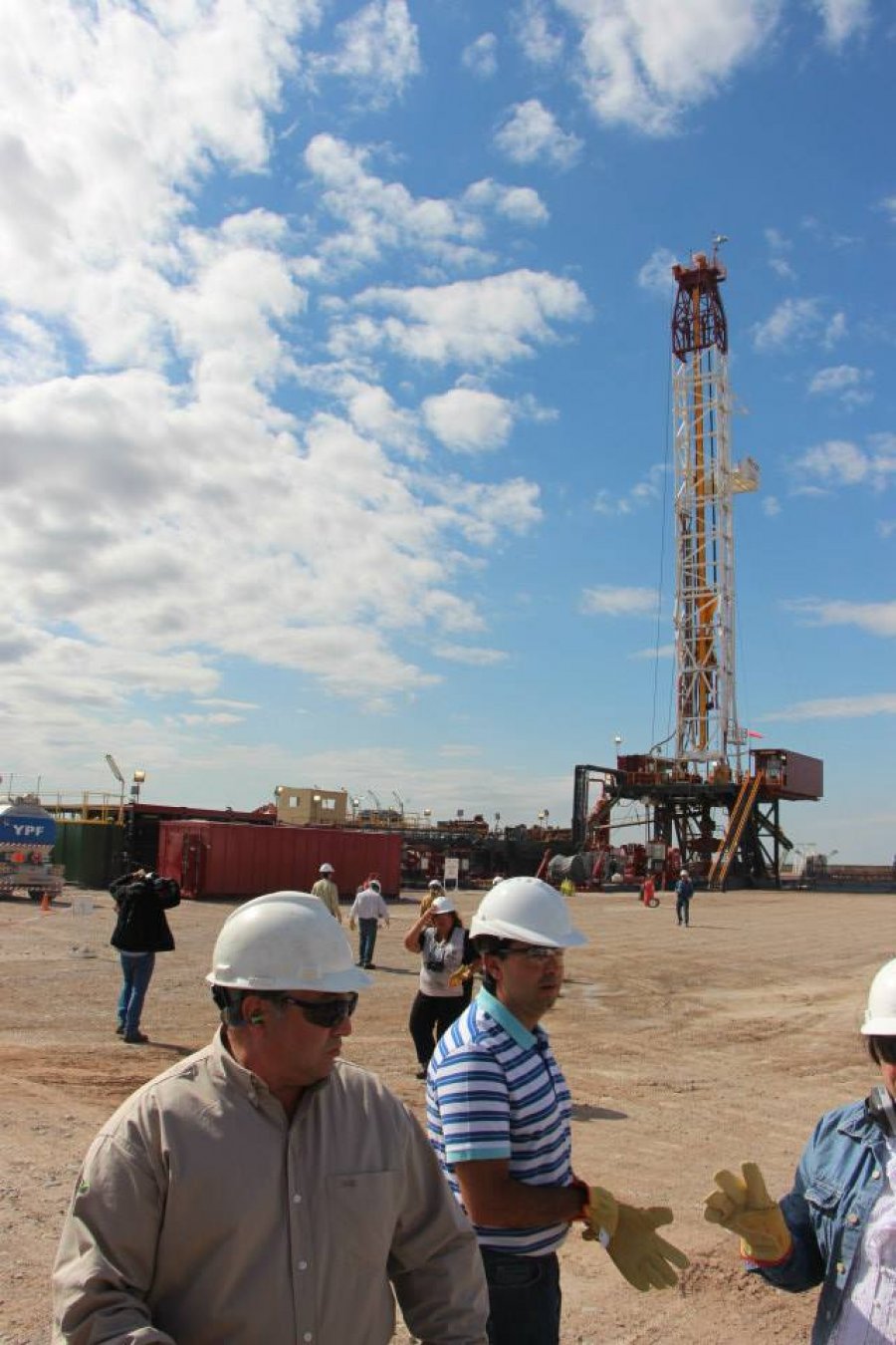 Personal de la empresa DLS, quien opera actualmente el pozo, nos recibió y nos indicaron las medidas de seguridad que debíamos cumplir dentro de la locación. Allí nos separaron en grupos, para poder acceder de cerca a la base del pozo donde una enorme estructura metálica está colocada y pudimos apreciar como las barras de perforación eran tomadas automáticamente y subidas para ser utilizadas. Llegaban a varios metros de altura, rotaban y se iban introduciendo en la tierra, y a metros la cabina de control donde supervisaban toda la operación.